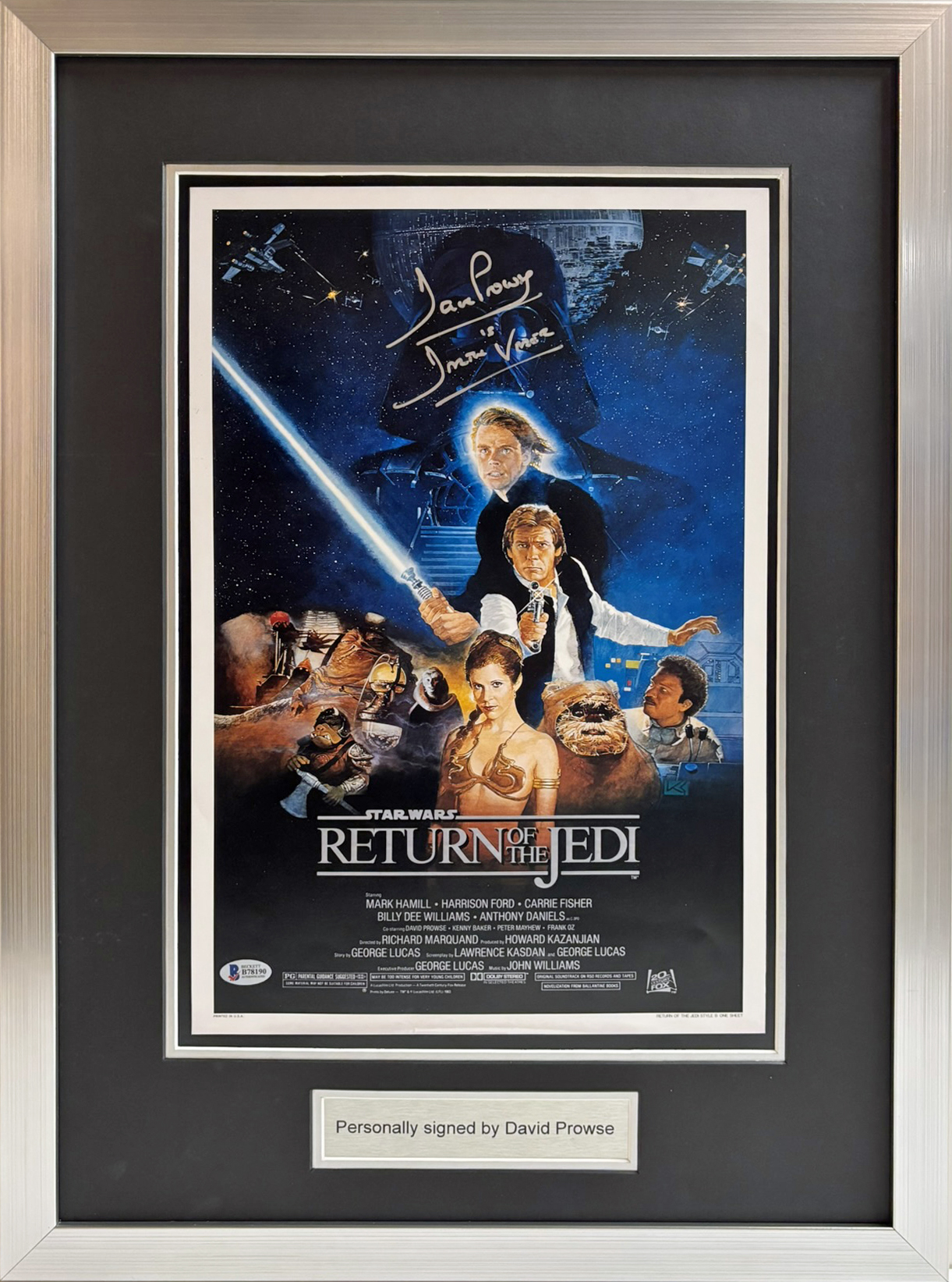 Own a true piece of cinematic history with this original Return of the Jedi poster, personally signed by David Prowse—the man behind Darth Vader.