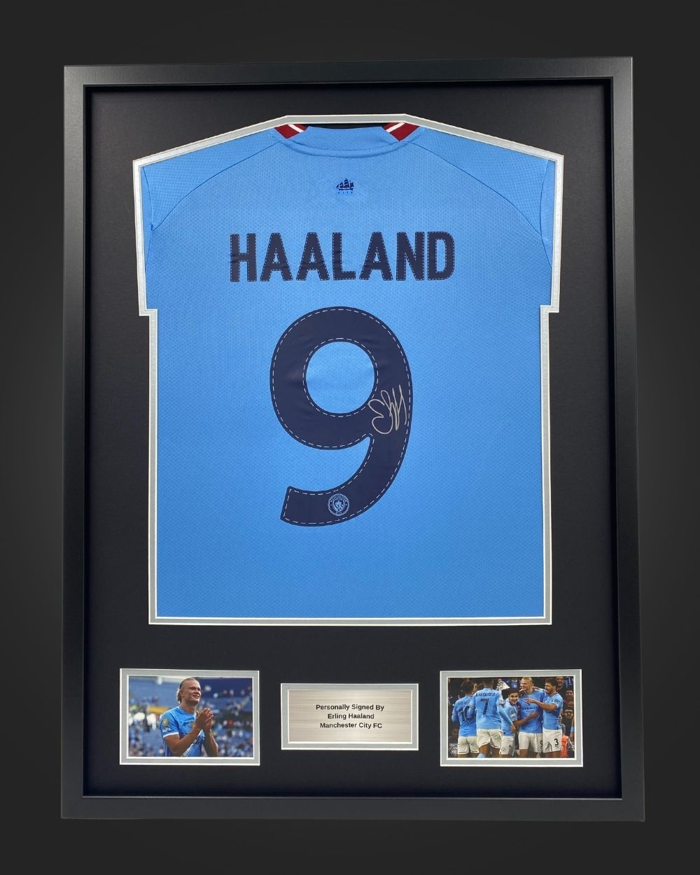 This premium presentation features an official shirt personally signed by Erling Haaland, professionally mounted in a sleek black and silver frame, complete with a descriptive plaque and two high-quality action photos — creating a standout centrepiece for any sports memorabilia collection.