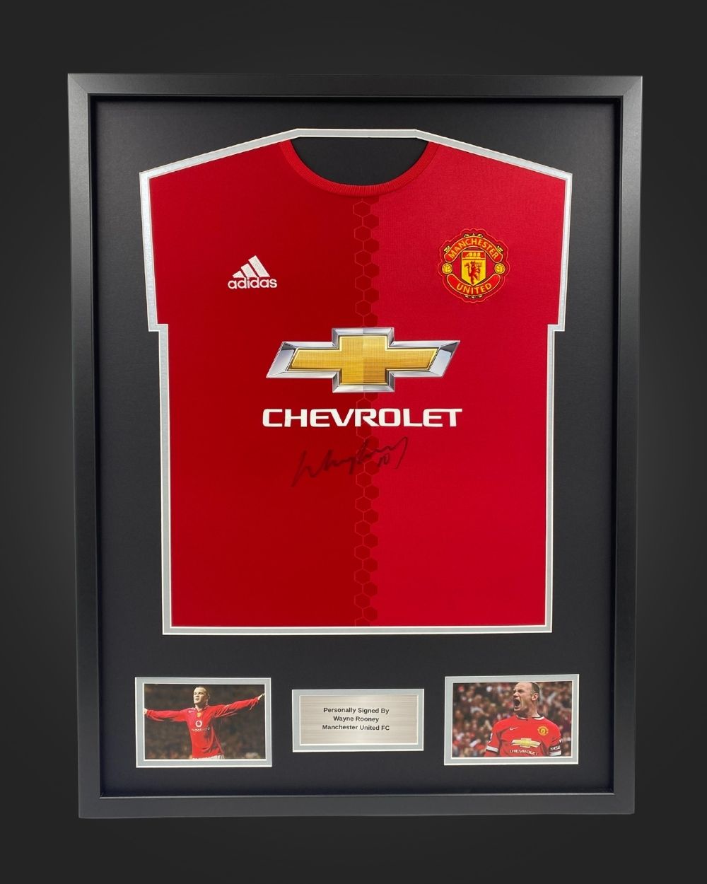 This premium presentation features an official shirt personally signed by Wayne Rooney, professionally mounted in a sleek black and silver frame, complete with a descriptive plaque and two high-quality action photos — creating a standout centrepiece for any sports memorabilia collection.